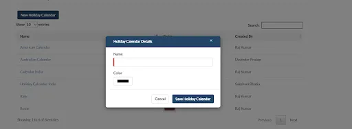 6. On clicking the “Save Holiday Calendar” button the calendar will be saved.
