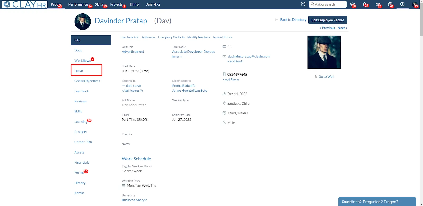 - Go to the User’s view page by clicking on the profile image. Then click on the Leave tab.