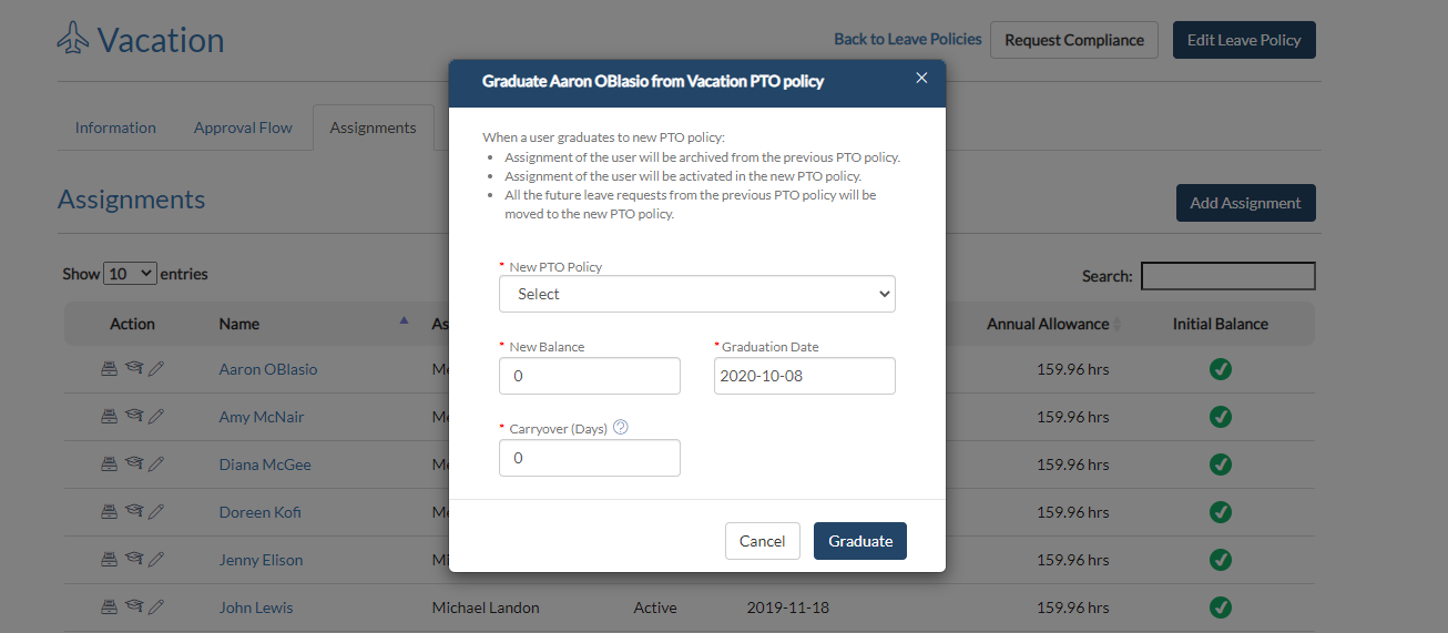 - Click on the Graduate button to migrate the user immediately to the new PTO Policy.