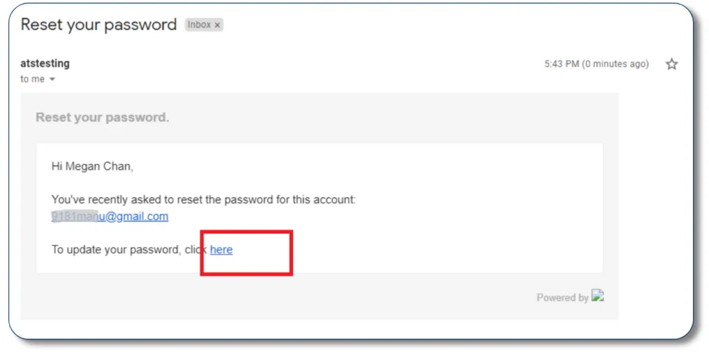 - In your email inbox, you find an email with the subject line – Reset your password. Please open that email and click – “here”.