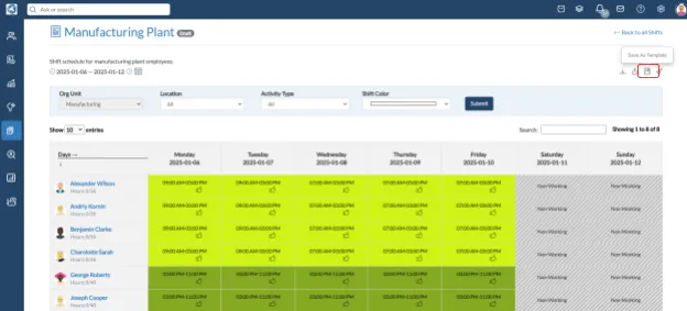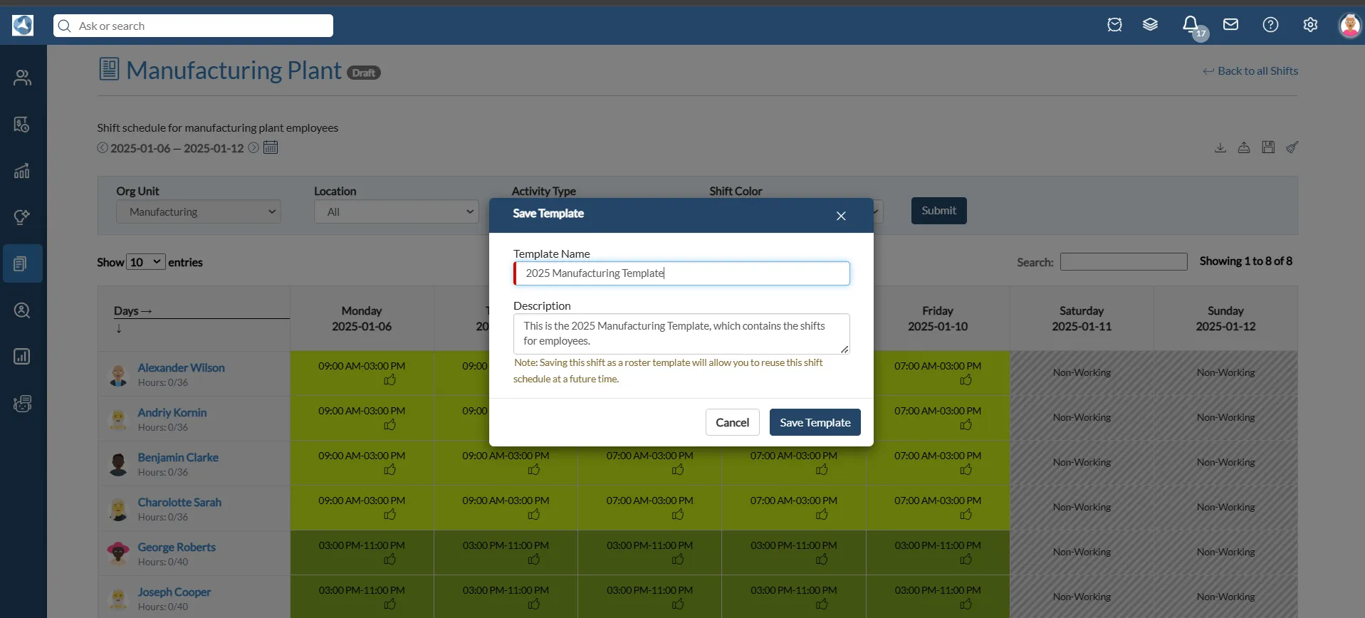 - After filling in the template name and description, save the template. This will add the shift timings defined in the shift to the template.