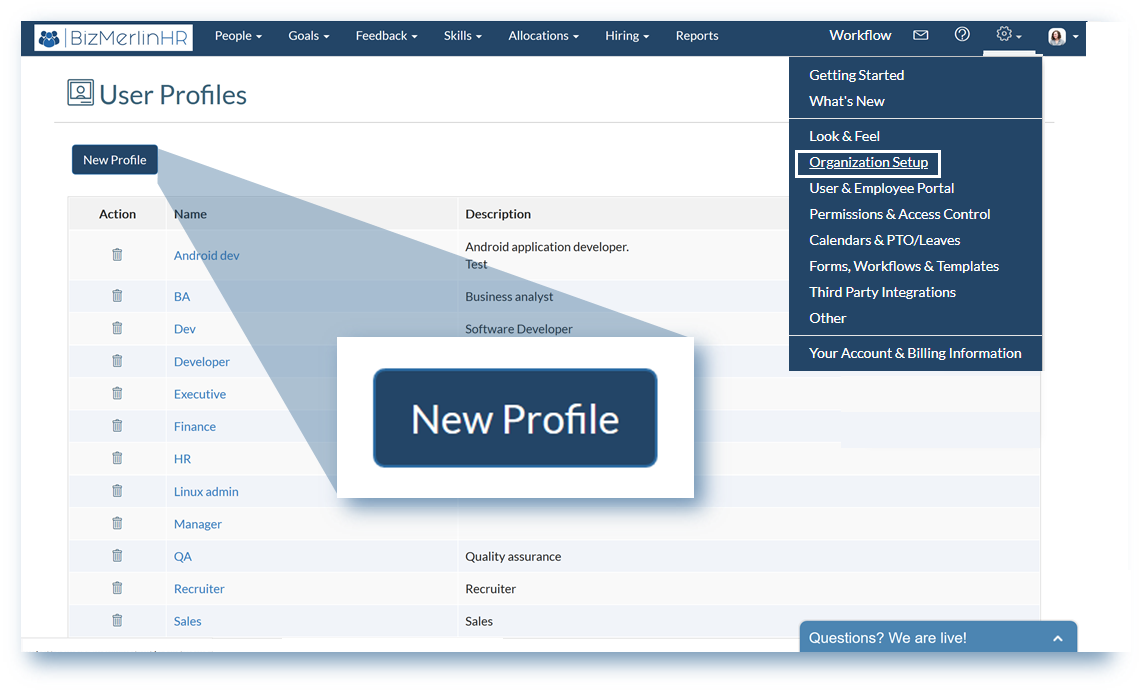 [To learn more about the Difference between "User Profile" | "User Role | "User Group", please, click here]What is a 'User Profile'User Profile refers to the main function or level a person has in an organization. Some examples are: junior developer, senior salesperson,but of course you have the flexibility to define the profiles that are relevant to your organization. However, to save you setup time, ClayHR comes with predefined profiles that you can keep, edit or remove.How to define 'User Profiles'