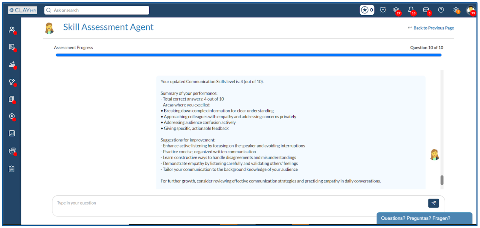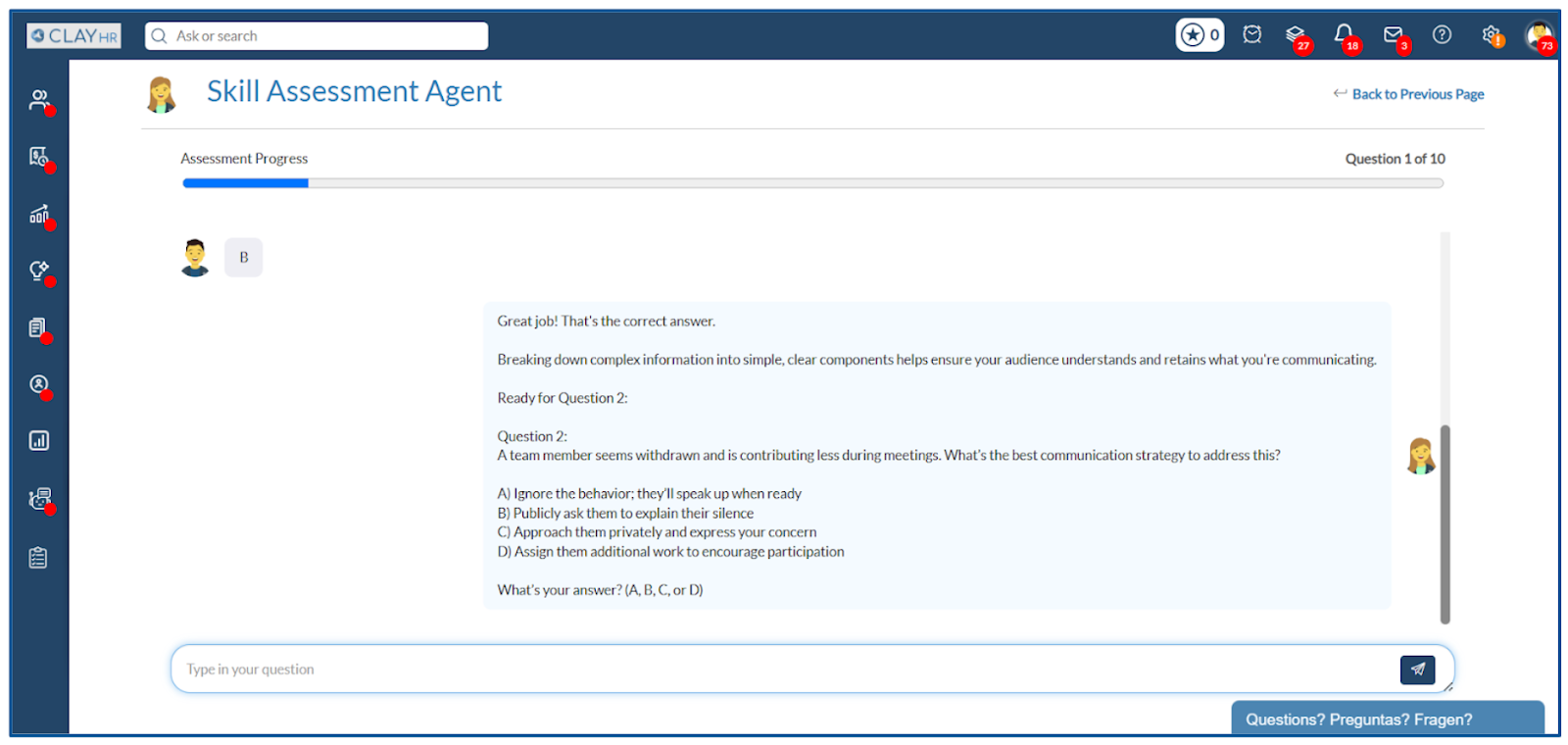 The Skill Assessment Agent enables users to easily evaluate and validate their skills through AI-powered assessments. It analyzes responses and performance data to determine proficiency levels across different skill areas. This helps employees gain a clear understanding of their strengths and identify opportunities for improvement. Managers and HR teams can use these insights to make informed decisions about learning, development, and career growth. The agent ensures fair, consistent, and data-driven skill evaluations across the organization. By automating the assessment process, it saves time and enhances accuracy. Overall, the Skill Assessment Agent supports a culture of continuous learning and skill-based development.