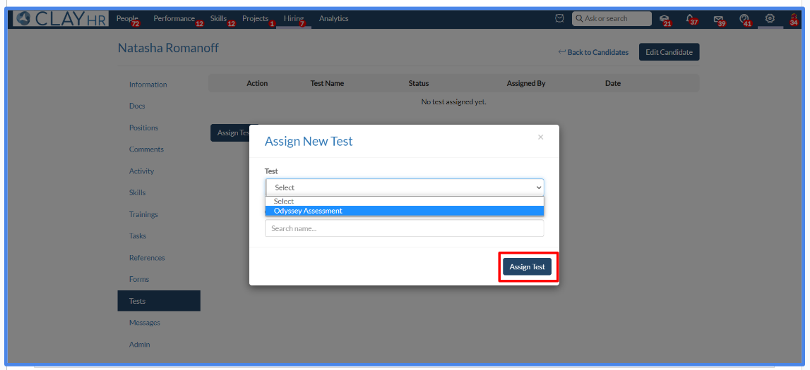 - In the test tab, assign a test named “Odyssey Assessment” to the candidate and click on the “Assign Test” button.