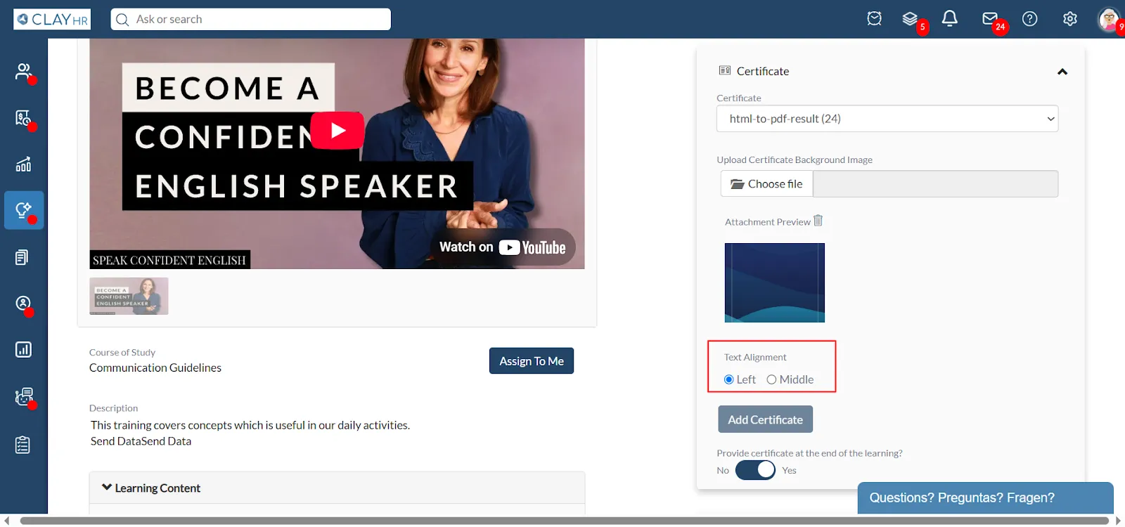 - Certificate Text Alignment: There are two types of text alignment options available in the certificate.