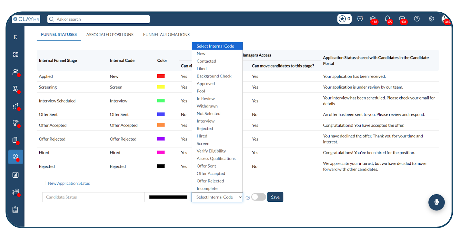 ClayHR triggers automated actions within the candidate funnel based on the internal codes assigned to statuses.