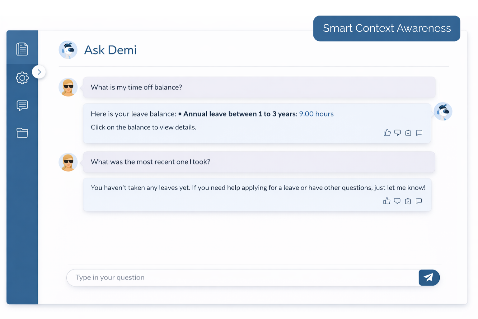 Ask HR remembers the context of an ongoing conversation. Employees can ask follow-up questions naturally without repeating themselves, enabling smooth, human-like interactions that feel intuitive and uninterrupted.