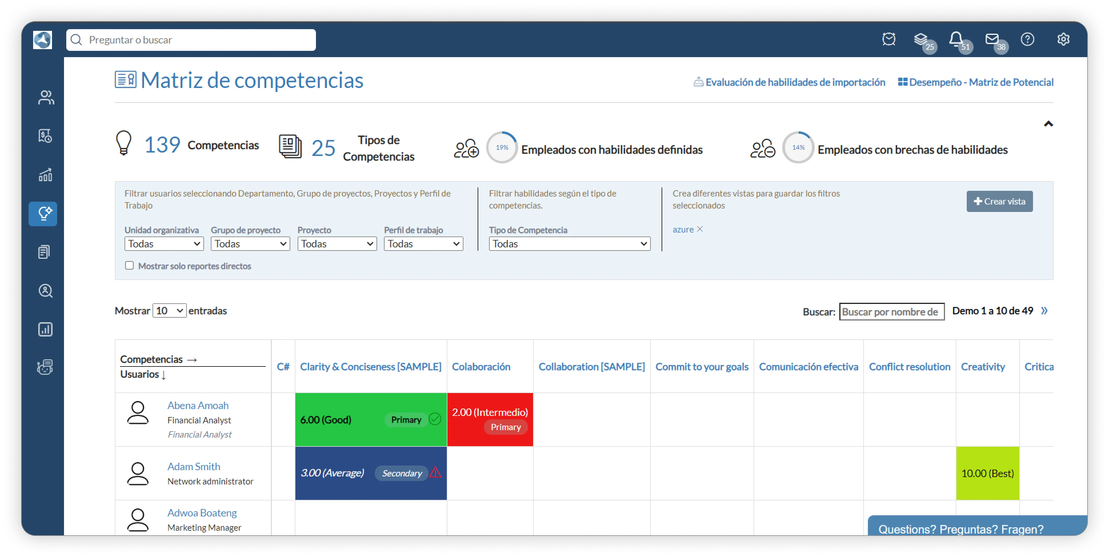 Diga adiós a las tediosas hojas de cálculo y dé la bienvenida a la matriz de competencias y habilidades de ClayHR, que se presentan de una forma visualmente atractiva.
