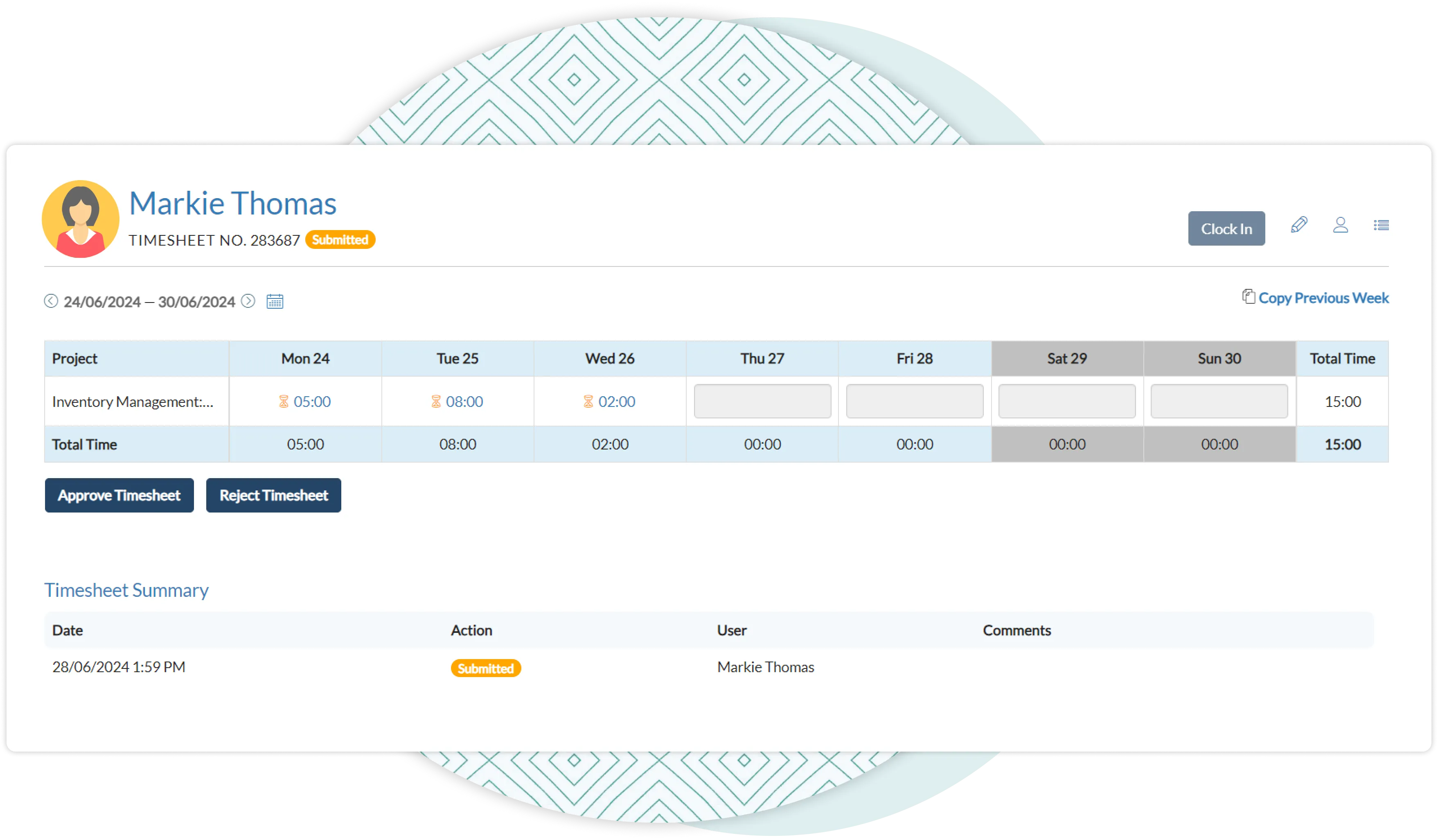 Track your team's attendance, and easily log your time to specific projects, including standard and overtime hours, activity type, and any additional details.