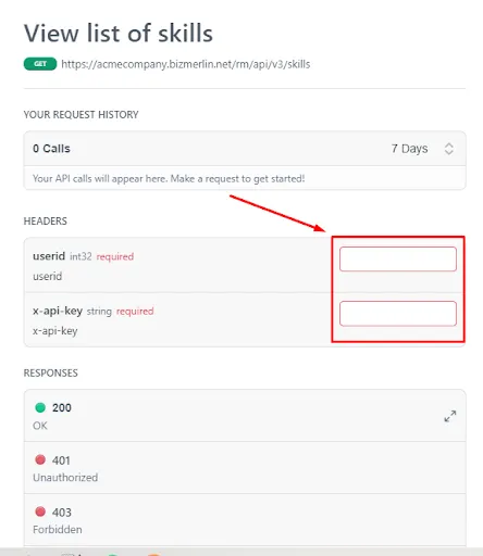 For e.g : To get the skills list navigate to the skills link from left panel and fill the User Id and API Key which you retrieved from your application