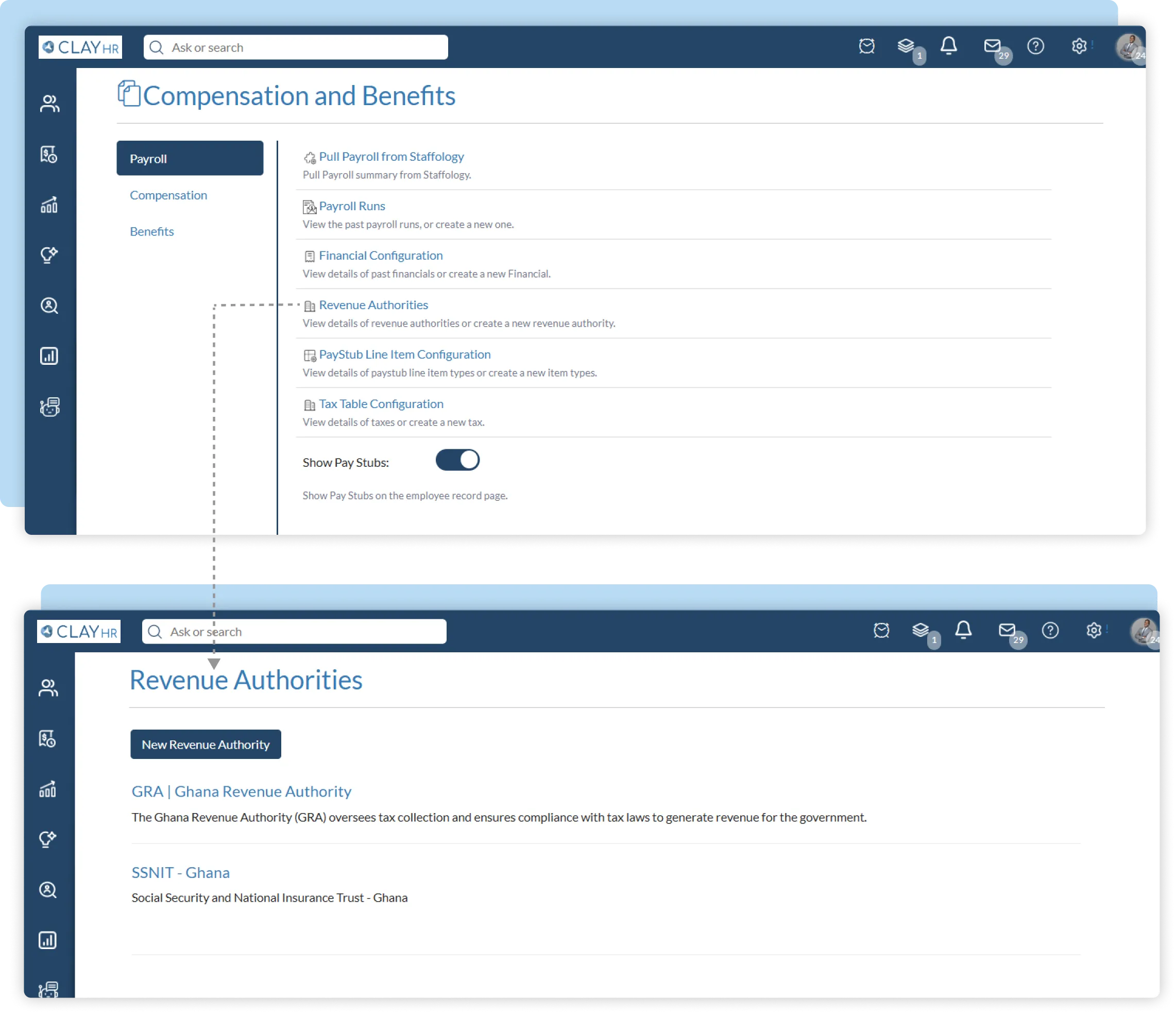 Ensure compliance with Ghana’s tax laws using predefined tax tables tailored to the local tax structure. ClayHR streamlines the process by automating tax calculations, so your payroll always aligns with current regulations.