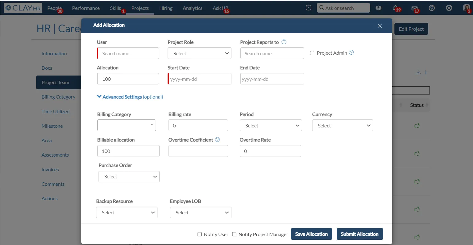 Assign people to project effortlessly by filling out a few necessary fields. Streamlined pay evaluation of billable team members. Make assigned user project admin with just one check.