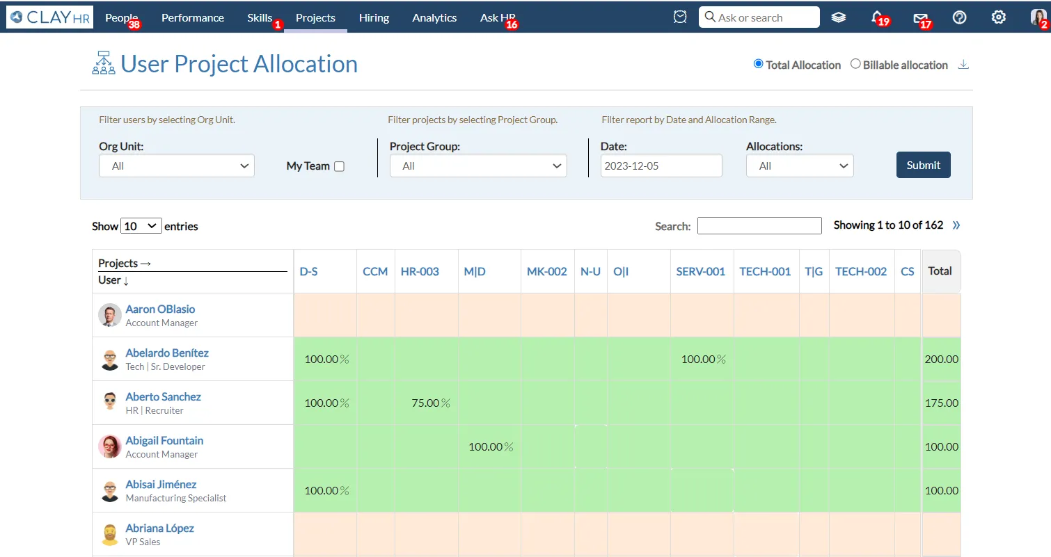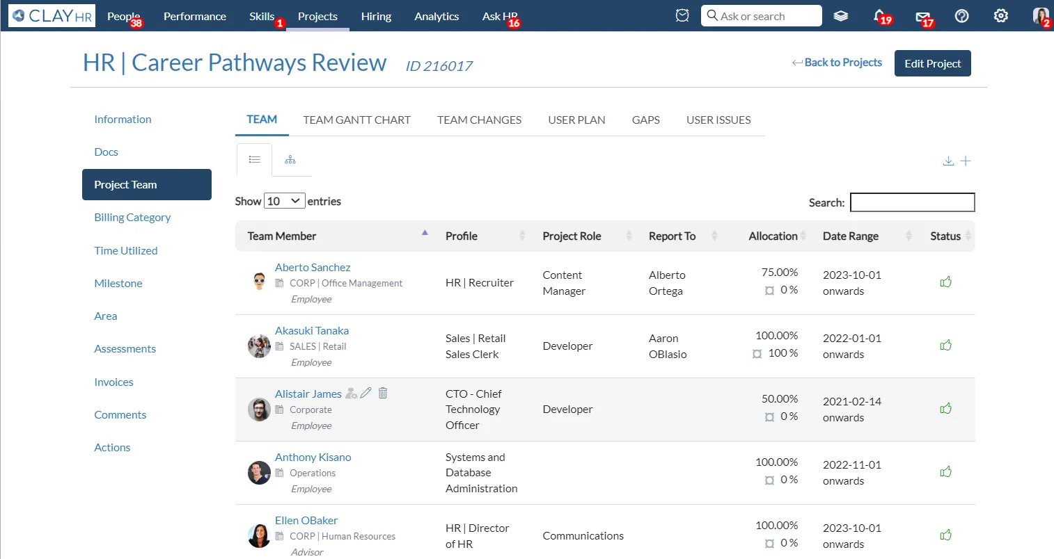 Access all prominent information about the assigned projects, including team members, profiles, allocation percentages, and project duties, in one place.