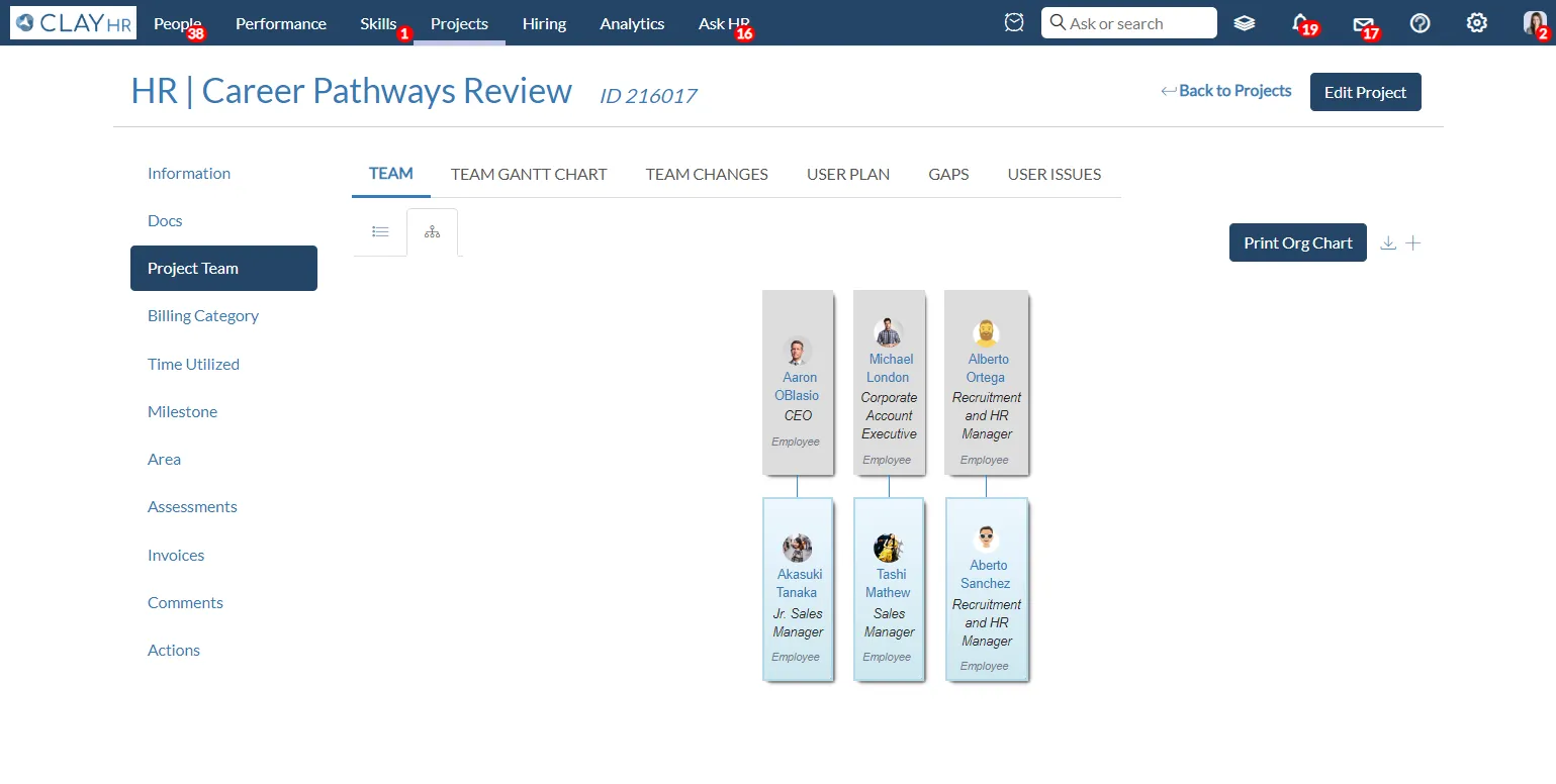 Auto-generated org chart illustrates employee’s hierarchical status relative to other individuals within the project. An explicit tree view also shows the name, image, and designation of the allocated user to the project.