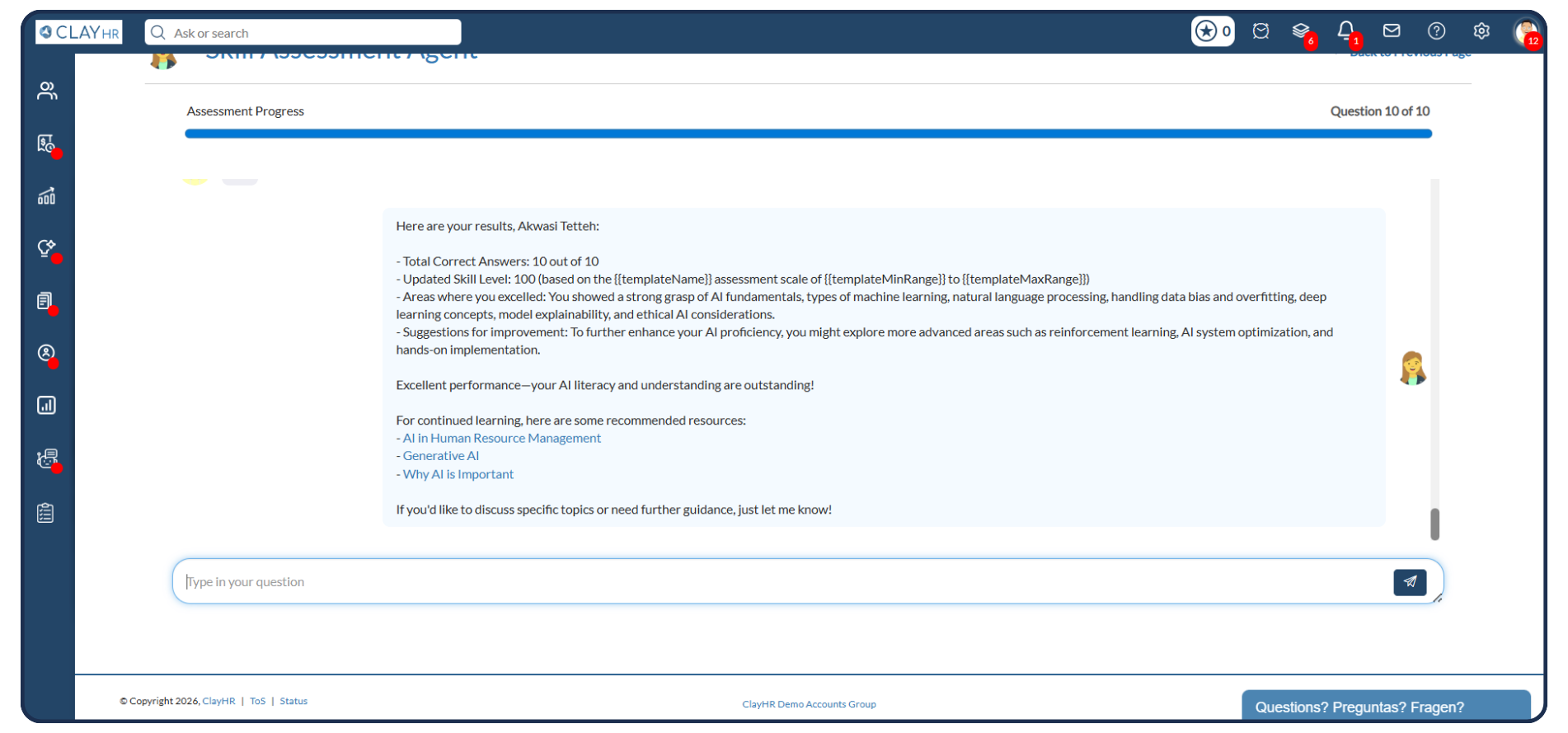 Assessments should provide instant insight. ClayHR’s AI evaluates applied capability in real time and automatically updates competency levels with personalized recommendations.