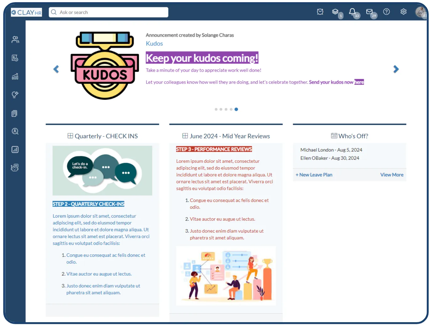 Using the default home dashboard for all your team members? With ClayHR, you can create multiple home dashboards tailored to your specific needs and assign them to specific users.This ensures that when your team members log in, they see information relevant to them.For example, for an HR manager, show them a dashboard that lets them instantly access upcoming performance reviews, who is off today, and compliance alerts. Meanwhile, for your finance team, highlight expense reports, and financial forecasts on your dashboard. Basically, by customizing your dashboards, you can easily access the information your team members need without being overwhelmed by irrelevant data.