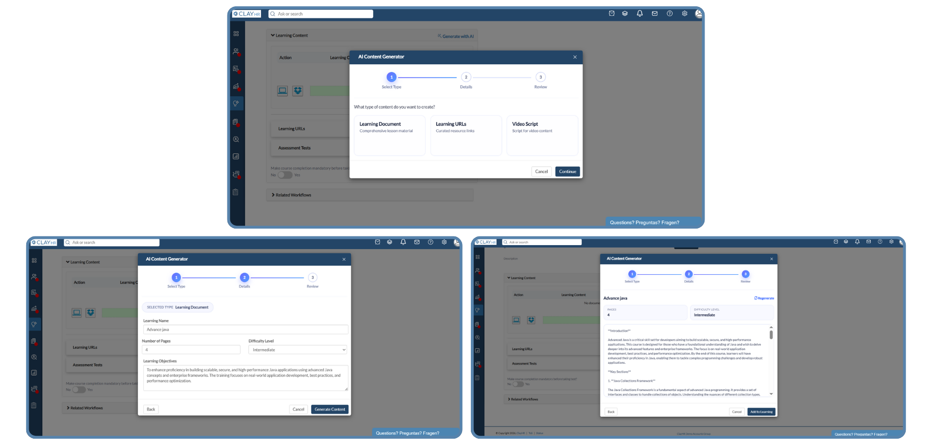 ClayHR simplifies learning creation with AI-powered content generation designed for modern L&D teams. Instantly create comprehensive Learning Documents, engaging Video Scripts, and curated Learning URLs—all tailored to your training objectives. This feature helps teams save time, ensure content consistency, and deliver high-quality learning experiences faster, without the effort of manual content creation.
