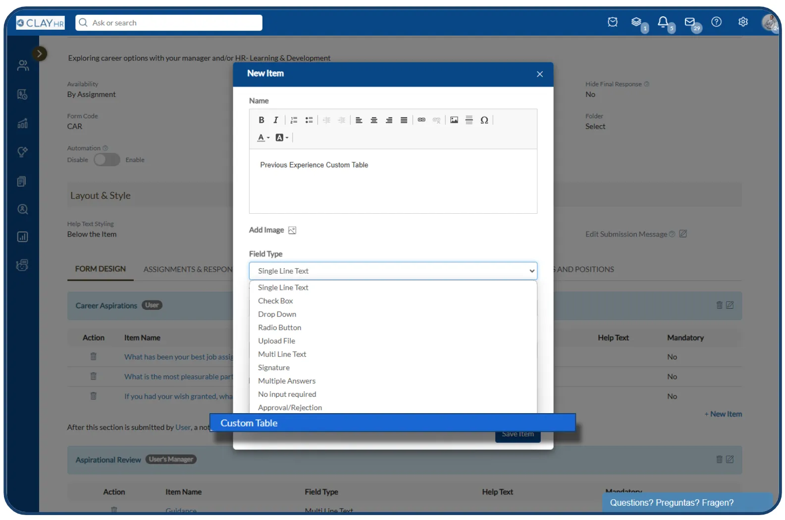 Forms are crucial for you to capture and manage data across various functions, but often, traditional forms lack flexibility, especially when dealing with complex data. Common challenge you may face is the inability to capture structured, multi-row data within a single form, leading to data disorganization and inefficiencies. With ClayHR add custom tables directly to forms, allowing you to capture detailed, organized data in rows and columns. This empowers you to streamline data entry, create dynamic forms that adapt to specific needs, and improve overall data accuracy and accessibility for better decision-making.