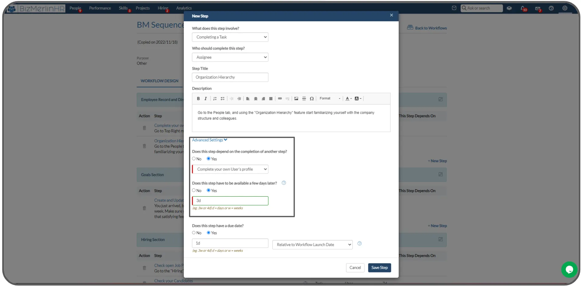 Workflows save a lot of time by optimizing the most common HR tasks. You can now set the availability dates of specific steps! You can also set the child step to become active when a parent step is completed. Or, you can set a specific number of days, after completion of the parent step when the child step should become available.
