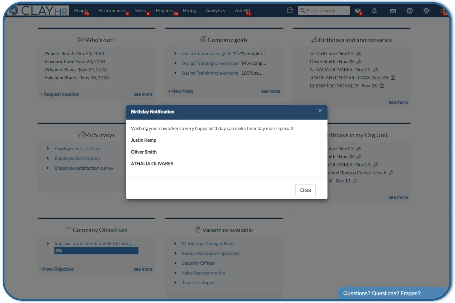 Performance reviews are crucial for streamlining your organization's efficiency. Within ClayHR, there has always been a performance review dashboard that provides you with essential information, including all review assignments, performance reviews by status, etc, in a user-friendly format. We have introduced a new performance dashboard. It gives a concise summary of various elements, such as total goals, check-ins, objectives, reviews, and awards, all presented in the form of cards. You can also keep a close eye on the categorization of the reviews, noting how many of them fall into the new assessment stage, are in progress, or have reached the completed assessment stage. You can also determine how many of the given feedback falls into different sentiment categories, such as neutral, positive, or negative.