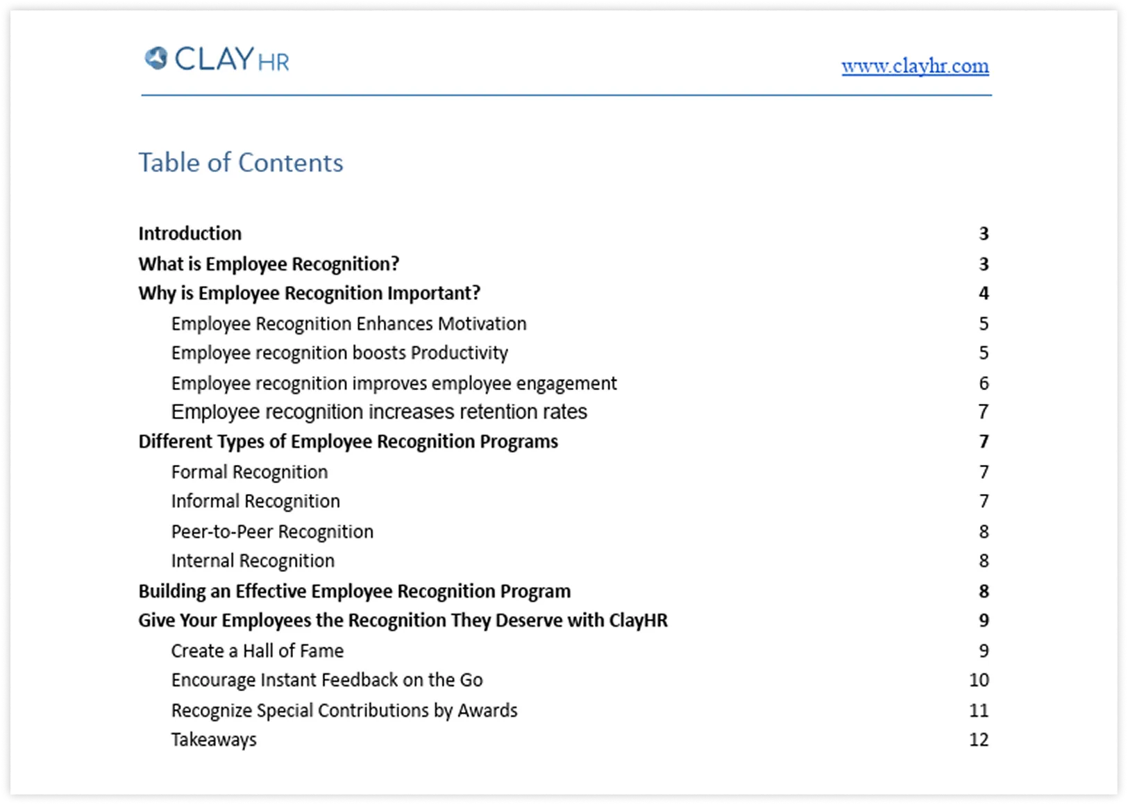 Employee recognition is essential for creating a motivated, productive, and loyal workforce. This white paper explores the importance of employee recognition and its positive impact on motivation, productivity, and retention. Learn about the different types of recognition programs and how to build an effective recognition system using ClayHR’s tools to give your employees the appreciation they deserve.